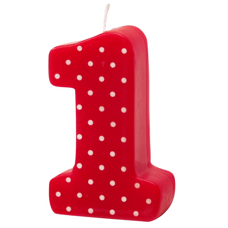 #1 Red Polka Dot Candle has red with white polka dots. Molded candle measures 7.5cm high.