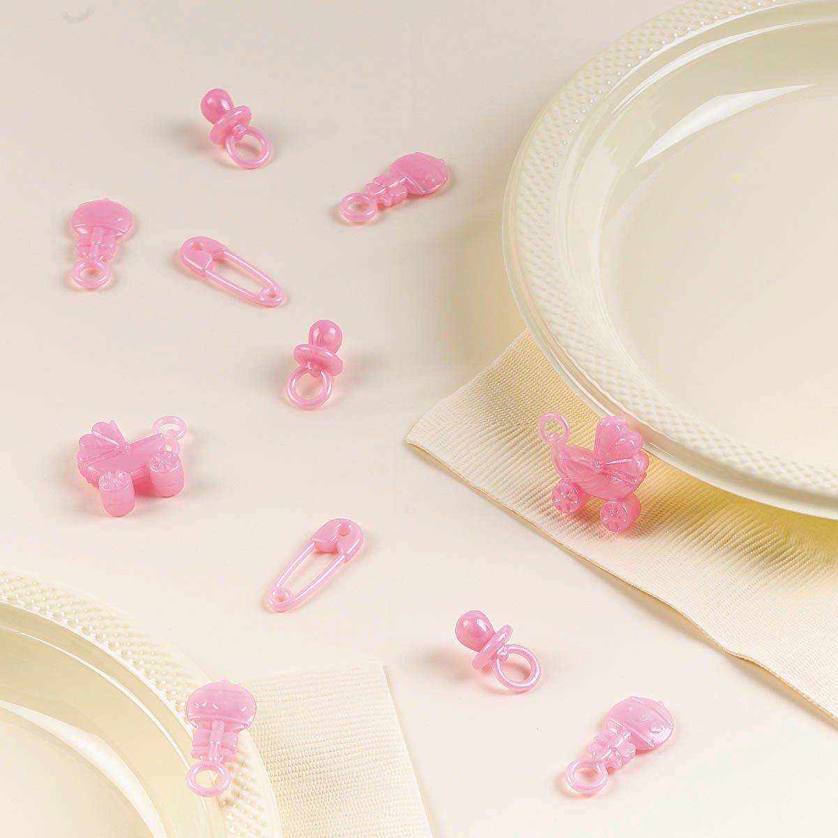 Package includes 25 pink plastic table sprinkles that come in an assortment of carriages, safety pins, dummies and rattles.