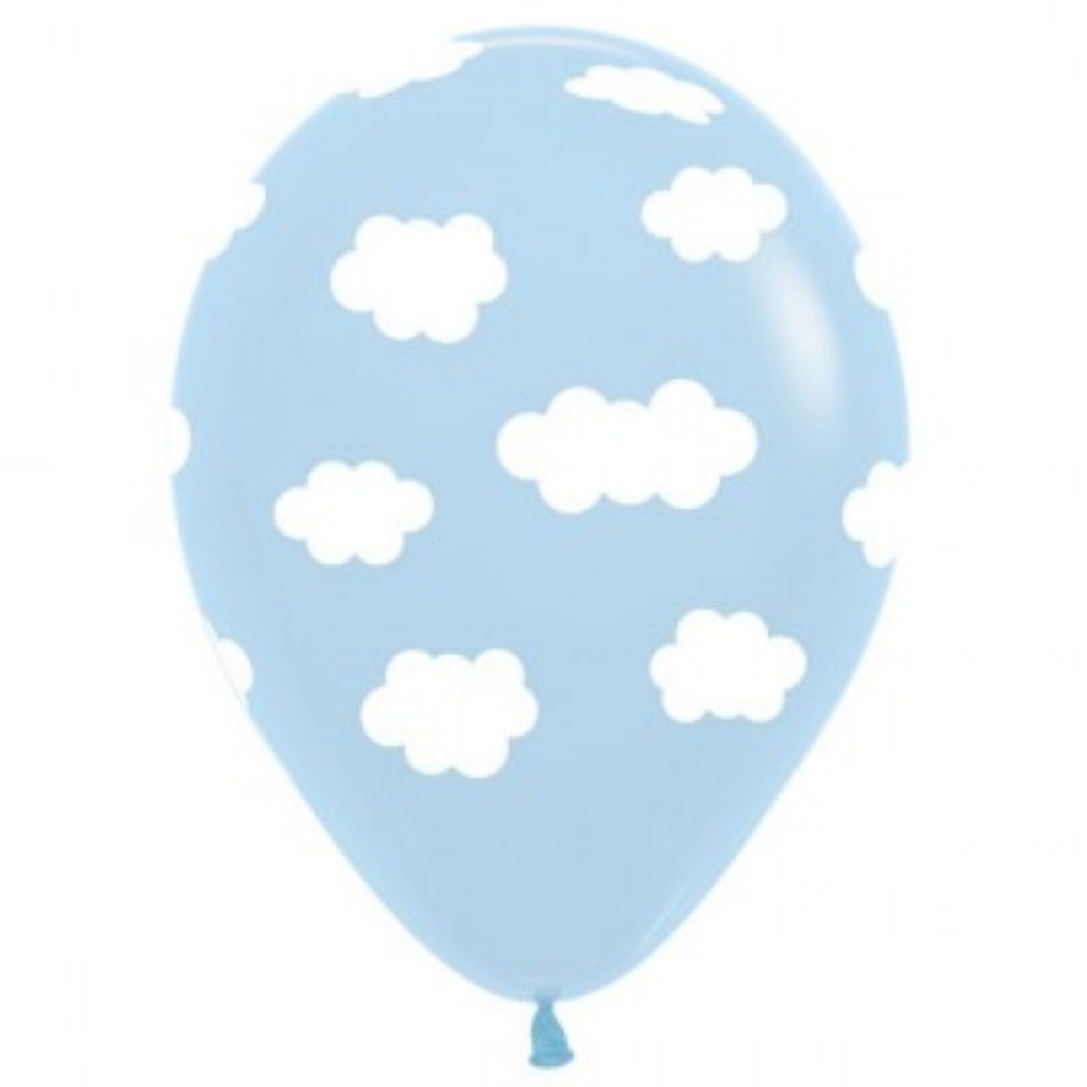 The latex balloons are Pale Blue in colour with White Clouds on them.