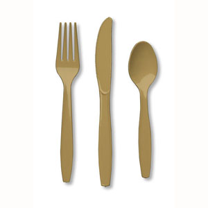 Cutlery Set – Gold. Includes 8 x Knives/ 8 x Forks/ 8 x Spoons. Each plastic set are washable and reusable. (24pc)
