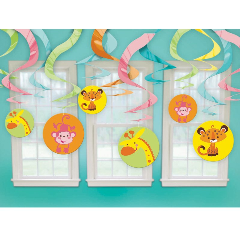 Includes 12 Fisher Price Baby Shower Hanging Swirl Decorations in various sizes from 12.7cm to 60.9cm big.