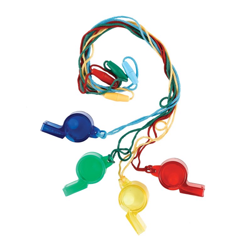 Includes 1 plastic play whistle with cord, assorted colours our choice please.