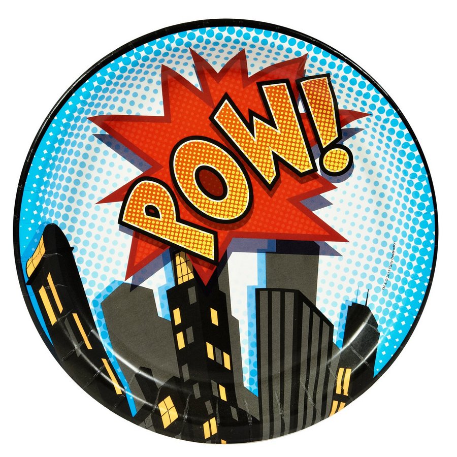 Includes: (8) themed 23cm paper dinner plates featuring the comic book style superhero theme.